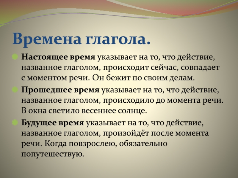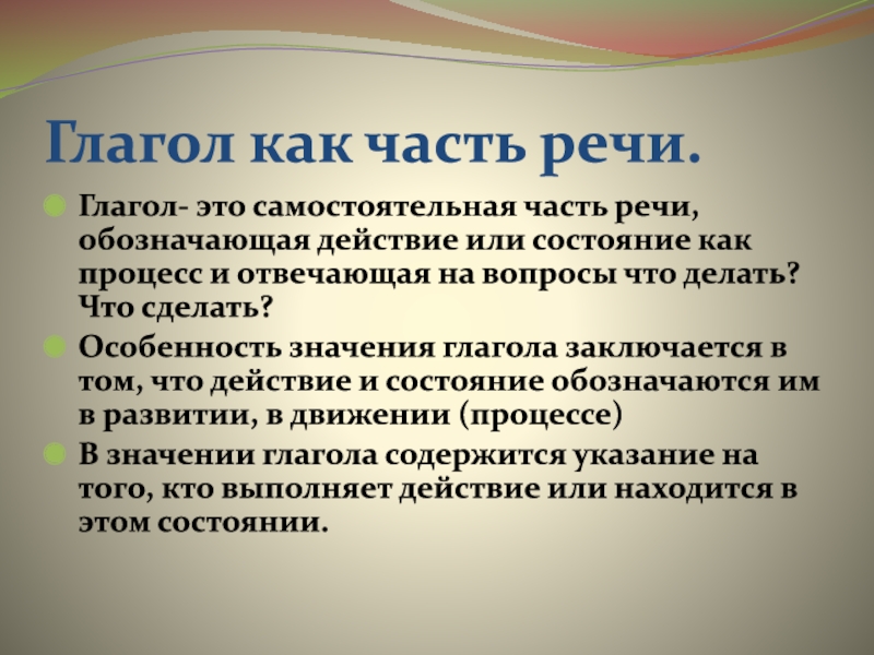 Особенность значения глагола заключается в том, что действие и состояние обозначаются им в развитии, в движении (процессе)