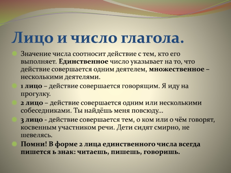 1 лицо – действие совершается говорящим. Я иду на прогулку.