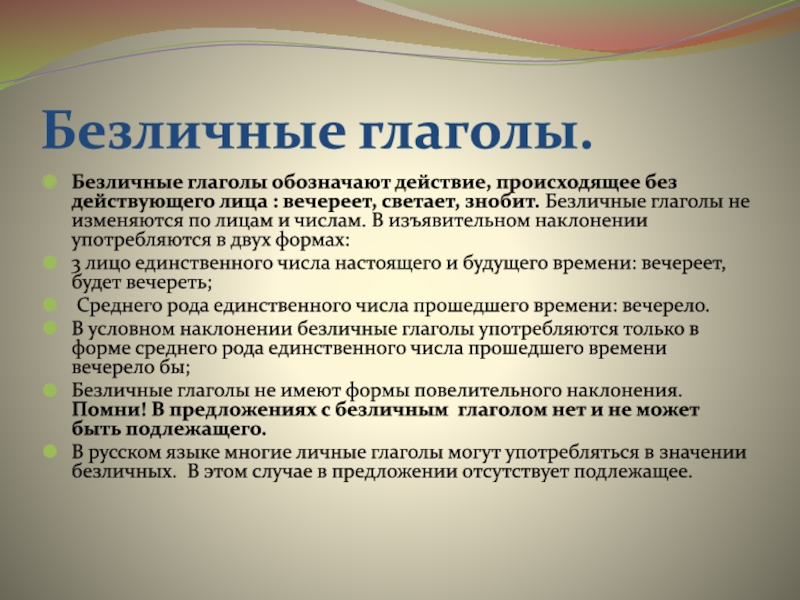 вечереет, светает, знобит. Безличные глаголы не изменяются по лицам и
