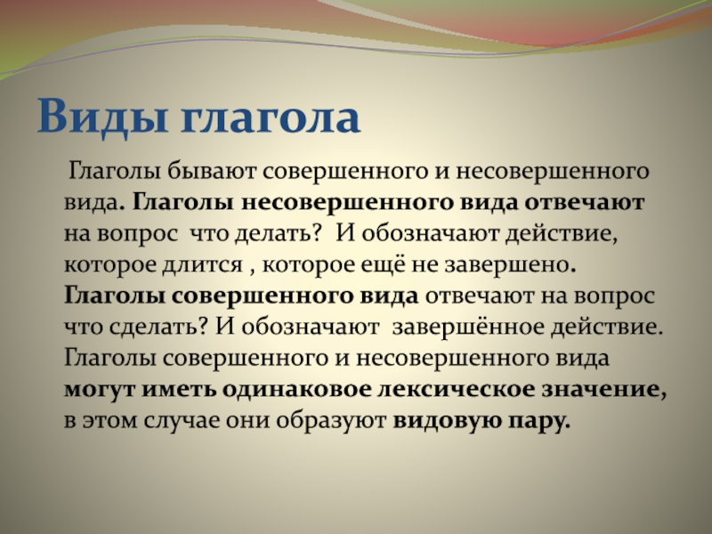 которое длится , которое ещё не завершено. Глаголы совершенного вида отвечают на вопрос что сделать? И обозначают завершённое действие. Глаголы совершенного и несовершенного вида могут иметь одинаковое лексическое значение, в этом случае они образуют видовую пару.
