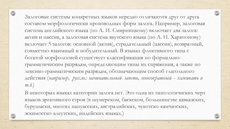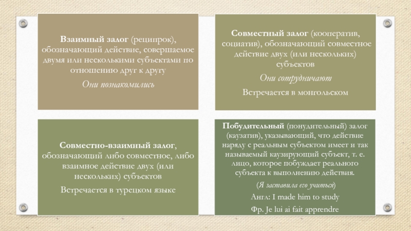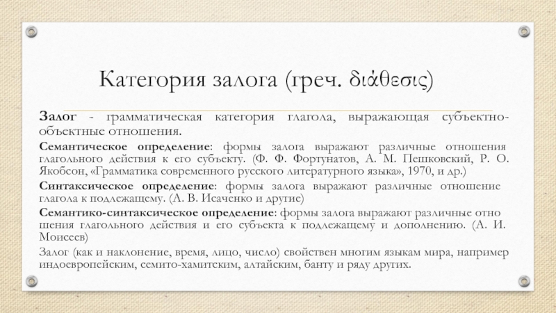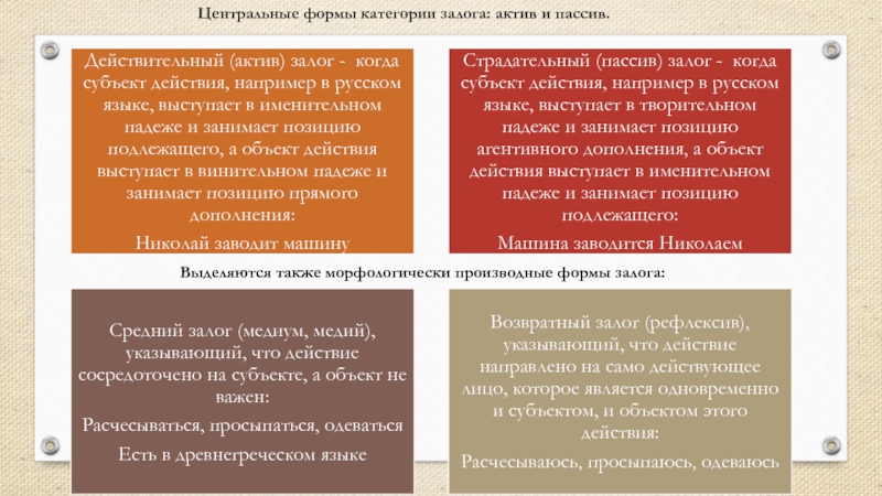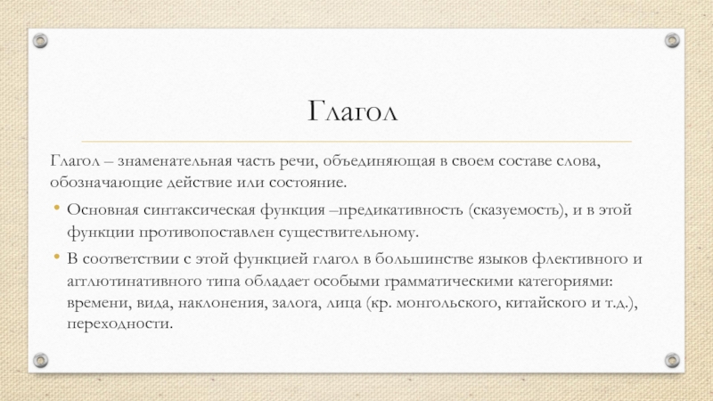 этой функции противопоставлен существительному.В соответствии с этой функцией глагол в большинстве языков флективного и агглютинативного типа обладает особыми грамматическими категориями: времени, вида, наклонения, залога, лица (кр. монгольского, китайского и т.д.), переходности.