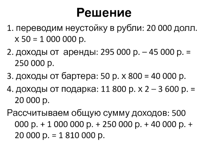 1. переводим неустойку в рубли: 20 000 долл. х 50