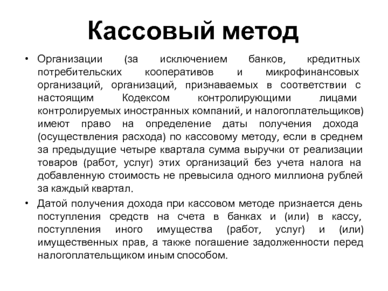 контролируемых иностранных компаний, и налогоплательщиков) имеют право на определение даты получения дохода (осуществления расхода) по кассовому методу, если в среднем за предыдущие четыре квартала сумма выручки от реализации товаров (работ, услуг) этих организаций без учета налога на добавленную стоимость не превысила одного миллиона рублей за каждый квартал.