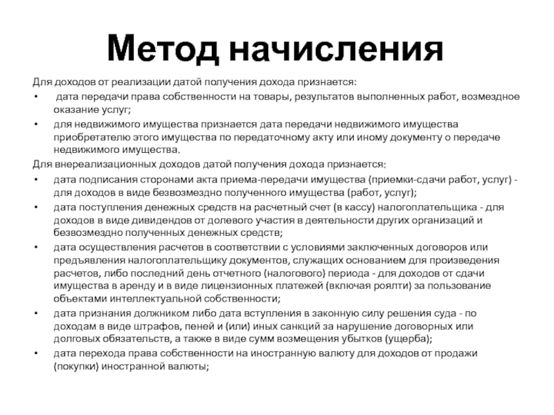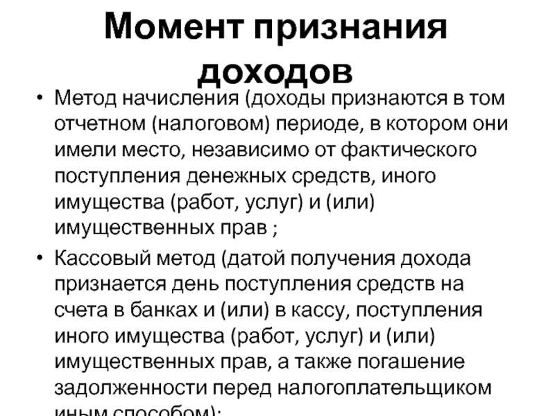 Кассовый метод (датой получения дохода признается день поступления средств на счета в банках и (или) в кассу, поступления иного имущества (работ, услуг) и (или) имущественных прав, а также погашение задолженности перед налогоплательщиком иным способом);