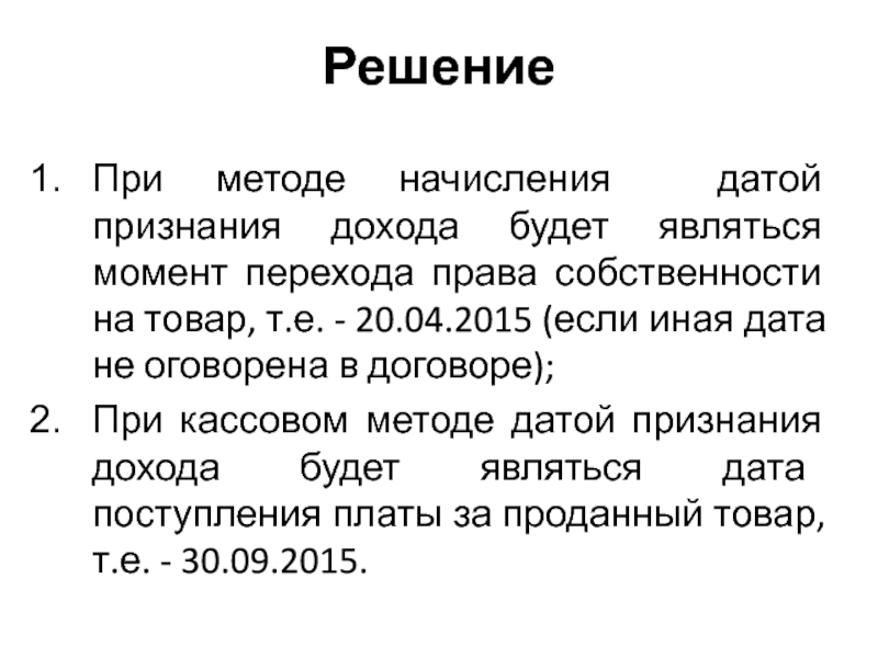 Необходимо определить момент признания дохода при методе начисления и кассовом методе.