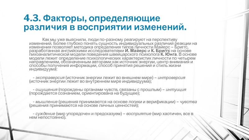 индивидуальных различий реакции на изменения позволяет методика определения типов личности Майерс – Бриггс, разработанная английскими исследователями И. Майерс и К. Бриггс на основе пихоаналитической модели поведения швейцарского психолога К. Юнга. В основе модели лежит определение психологических характеристик личности по четырем направлениям, обозначенным авторами как источник энергии, центр внимания и способы получения информации, способ принятия решений и стиль жизни индивидуума: