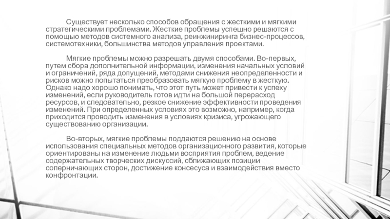 Мягкие проблемы можно разрешать двумя способами. Во-первых, путем сбора дополнительной информации, изменения начальных условий и ограничений, ряда допущений, методами снижения неопределенности и рисков можно попытаться преобразовать мягкую проблему в жесткую. Однако надо хорошо понимать, что этот путь может привести к успеху изменений, если руководитель готов идти на большой перерасход ресурсов, и следовательно, резкое снижение эффективности проведения изменений. При определенных условиях это возможно, например, когда приходится проводить изменения в условиях кризиса, угрожающего существованию организации.