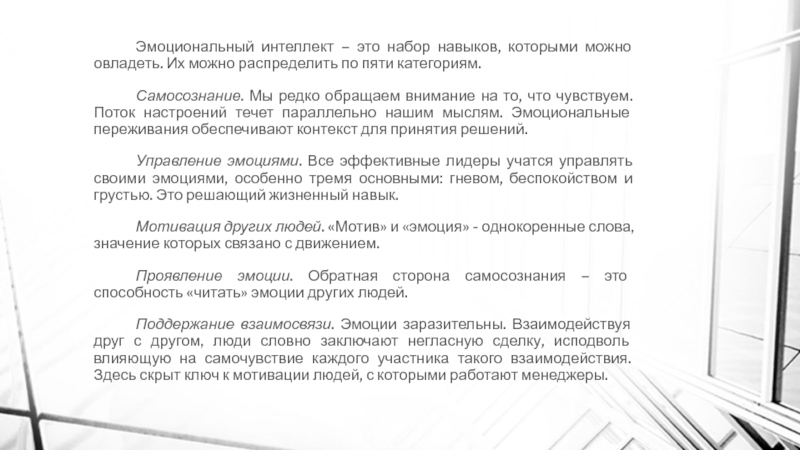 и эмоциональным фоном, сопровождающим изменения. Для успеха здесь многое можно почерпнуть из теории эмоционального интеллекта, разработанной американским психологом Д. Гоулманом в конце прошлого века. Он отмечал, что для успешного руководства такие человеческие качества руководителя, как самосознание, самодисциплина, настойчивость и эмпатия, гораздо важнее коэффициента интеллекта, а пренебрежение эмоциональными способностями снижает эффективность лидерства.
