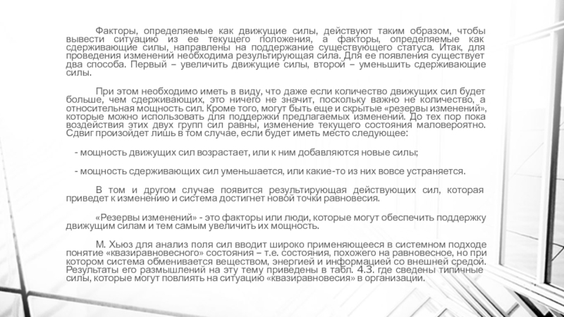 стороны людей в организации, а также отсутствуют какие-либо внешние обстоятельства, мешающие его осуществлению. В реальности любое изменение сталкивается как с сдерживающими силами изменений, так и с движущими силами изменений. Возникает проблема баланса движущих и сдерживающих сил, который определит судьбу изменения.