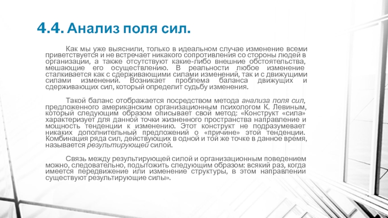 Связь между результирующей силой и организационным поведением можно, следовательно, подытожить следующим образом: всякий раз, когда имеется передвижение или изменение структуры, в этом направлении существуют результирующие силы».