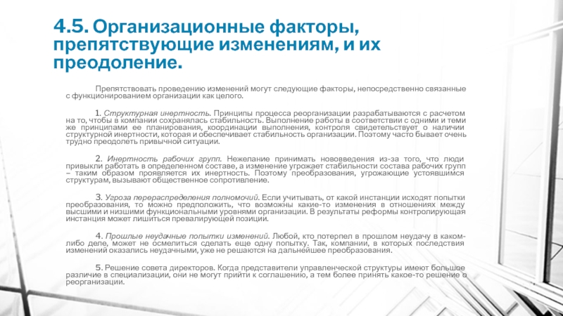 Слайд 134.5. Организационные факторы, препятствующие изменениям, и их преодоление.