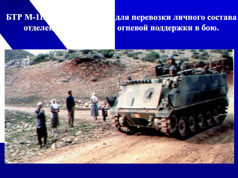 Слайд 15БТР М-113А1 предназначен для перевозки личного состава отделения к полю