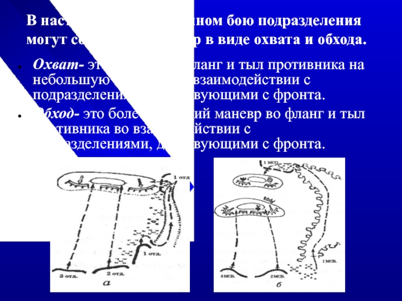 Обход- это более глубокий маневр во фланг и тыл противника во взаимодействии с подразделениями, действующими с фронта.