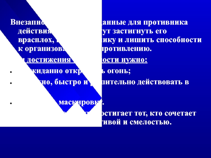 Слайд 37Внезапность- это неожиданные для противника действия, которые могут застигнуть его
