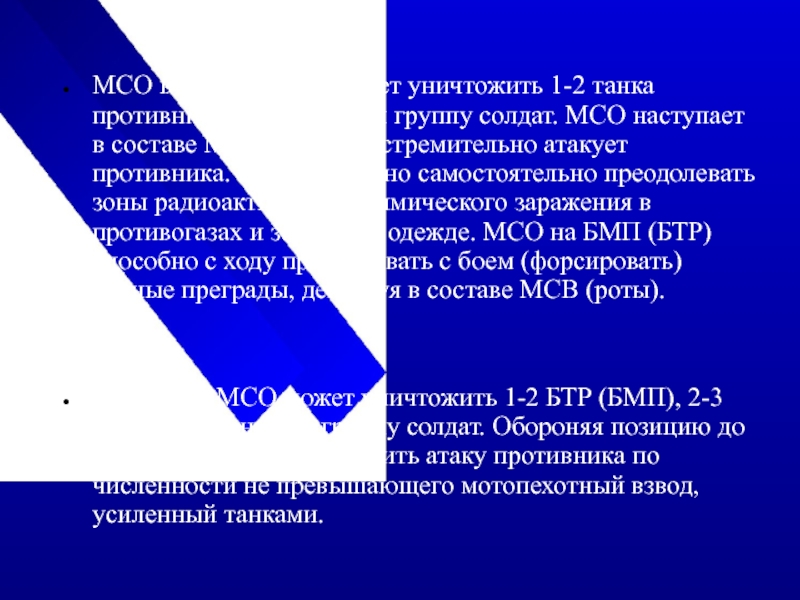 стремительно атакует противника. МСО способно самостоятельно преодолевать зоны радиоактивного и химического заражения в противогазах и защитной одежде. МСО на БМП (БТР) способно с ходу преодолевать с боем (форсировать) водные преграды, действуя в составе МСВ (роты).