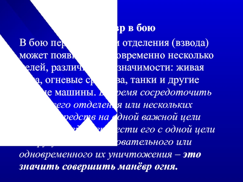 танки и другие боевые машины. Вовремя сосредоточить огонь всего отделения или нескольких огневых средств на одной важной цели (группе целей), перенести его с одной цели на другую для последовательного или одновременного их уничтожения – это значить совершить манёвр огня.