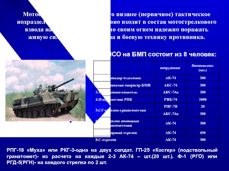 входит в состав мотострелкового взвода на БМП (БТР), способно своим