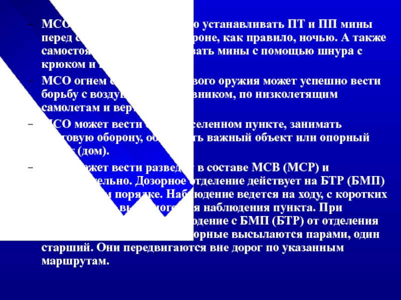 Слайд 48МСО может самостоятельно устанавливать ПТ и ПП мины перед своей