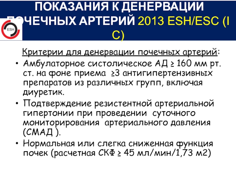 ПОКАЗАНИЯ К ДЕНЕРВАЦИИ ПОЧЕЧНЫХ АРТЕРИЙ 2013 ESH/ESC (I C)
