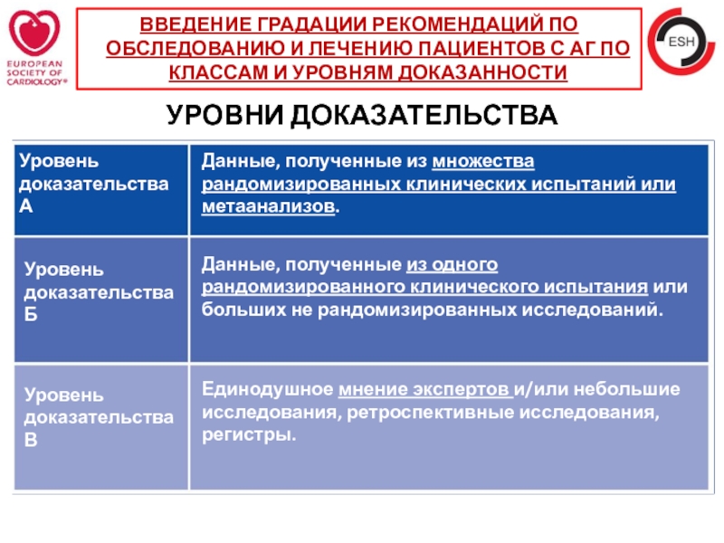 ВВЕДЕНИЕ ГРАДАЦИИ РЕКОМЕНДАЦИЙ ПО ОБСЛЕДОВАНИЮ И ЛЕЧЕНИЮ ПАЦИЕНТОВ С АГ ПО КЛАССАМ И УРОВНЯМ ДОКАЗАННОСТИ