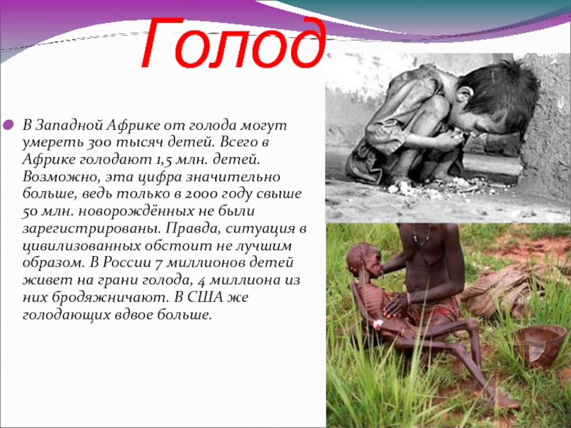 значительно больше, ведь только в 2000 году свыше 50 млн. новорождённых не были зарегистрированы. Правда, ситуация в цивилизованных обстоит не лучшим образом. В России 7 миллионов детей живет на грани голода, 4 миллиона из них бродяжничают. В США же голодающих вдвое больше.