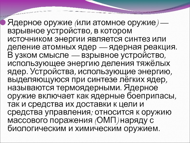 реакция. В узком смысле — взрывное устройство, использующее энергию деления тяжёлых ядер. Устройства, использующие энергию, выделяющуюся при синтезе лёгких ядер, называются термоядерными. Ядерное оружие включает как ядерные боеприпасы, так и средства их доставки к цели и средства управления; относится к оружию массового поражения (ОМП) наряду с биологическим и химическим оружием.