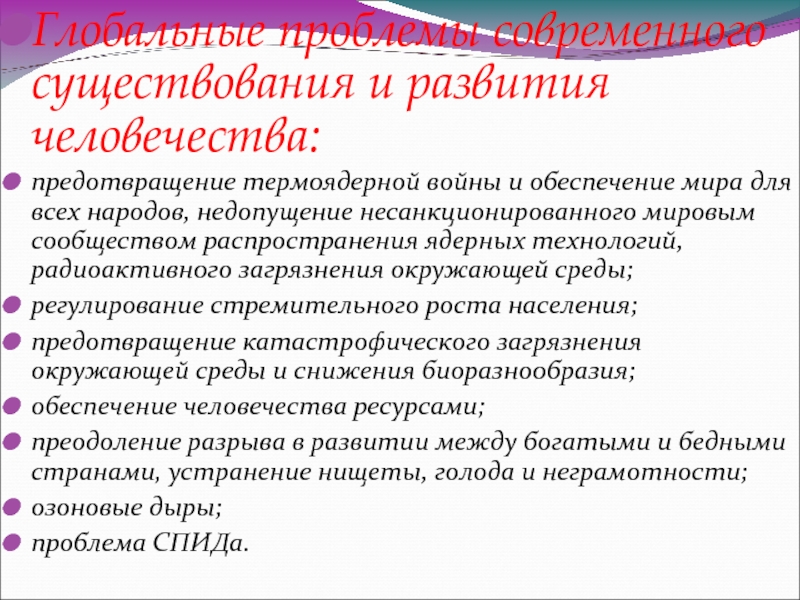 Слайд 3Глобальные проблемы современного существования и развития человечества: