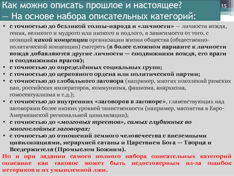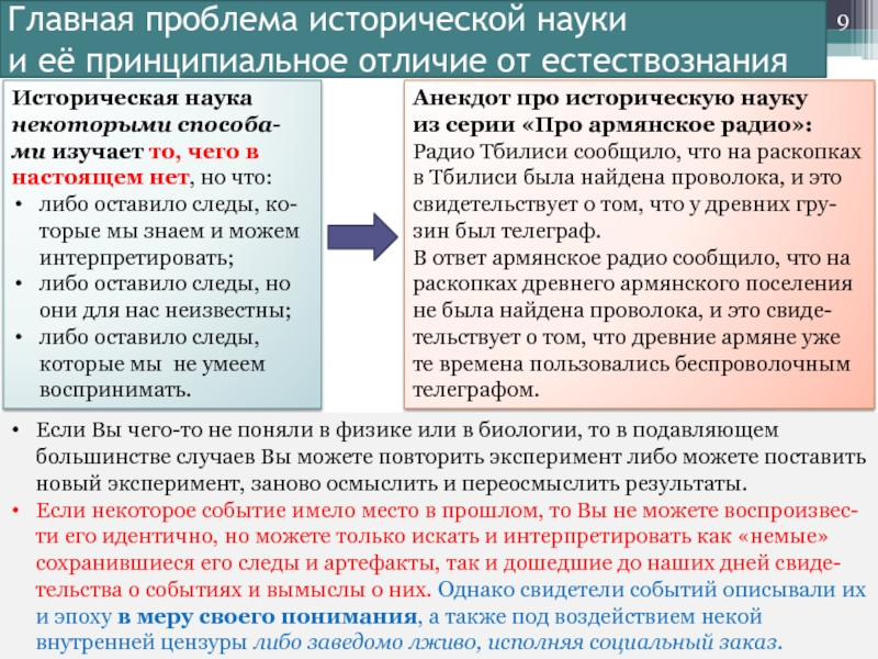 Если некоторое событие имело место в прошлом, то Вы не можете воспроизвес-ти его идентично, но можете только искать и интерпретировать как «немые» сохранившиеся его следы и артефакты, так и дошедшие до наших дней свиде-тельства о событиях и вымыслы о них. Однако свидетели событий описывали их и эпоху в меру своего понимания, а также под воздействием некой внутренней цензуры либо заведомо лживо, исполняя социальный заказ.
