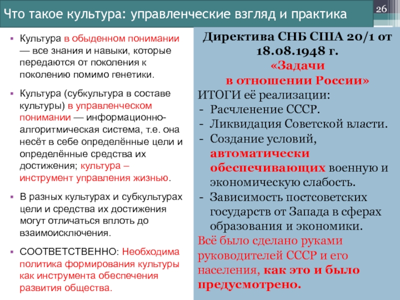 Концепция глобализации как войны за мировое господство на основе целесообразной модификации культур народов как информационно-алгоритмических систем.