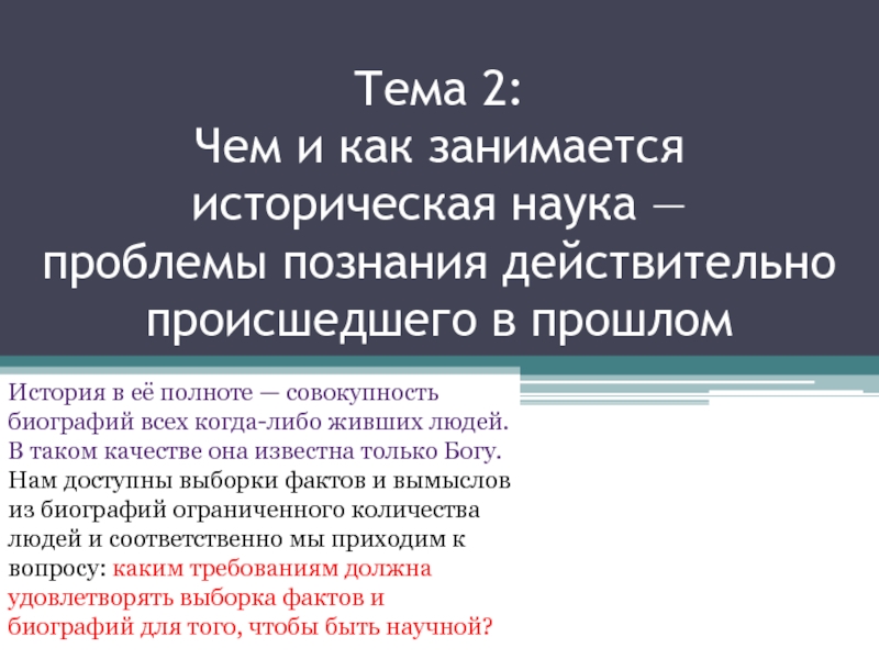 Нам доступны выборки фактов и вымыслов из биографий ограниченного количества людей и соответственно мы приходим к вопросу: каким требованиям должна удовлетворять выборка фактов и биографий для того, чтобы быть научной?