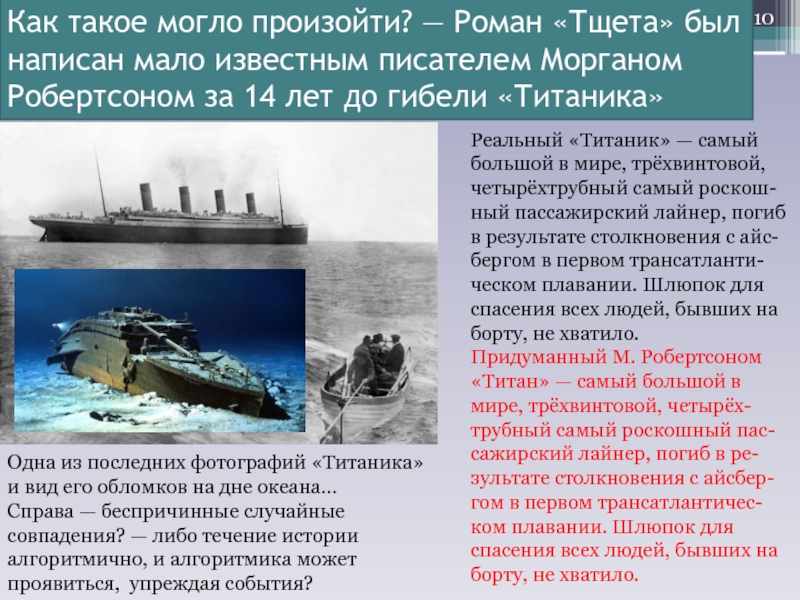 Придуманный М. Робертсоном «Титан» — самый большой в мире, трёхвинтовой, четырёх-трубный самый роскошный пас-сажирский лайнер, погиб в ре-зультате столкновения с айсбер-гом в первом трансатлантичес-ком плавании. Шлюпок для спасения всех людей, бывших на борту, не хватило.