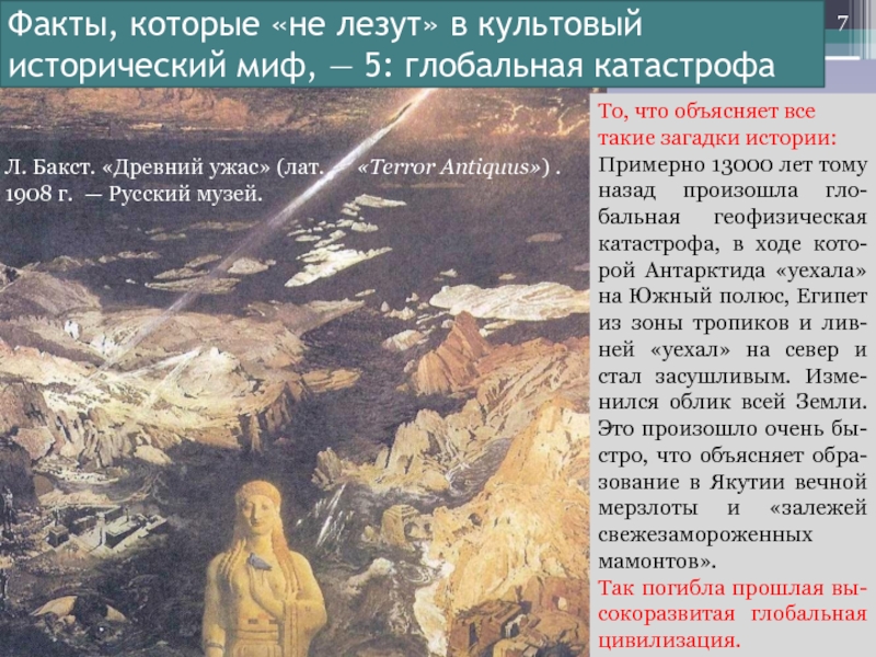 тому назад произошла гло-бальная геофизическая катастрофа, в ходе кото-рой Антарктида «уехала» на Южный полюс, Египет из зоны тропиков и лив-ней «уехал» на север и стал засушливым. Изме-нился облик всей Земли. Это произошло очень бы-стро, что объясняет обра-зование в Якутии вечной мерзлоты и «залежей свежезамороженных мамонтов».