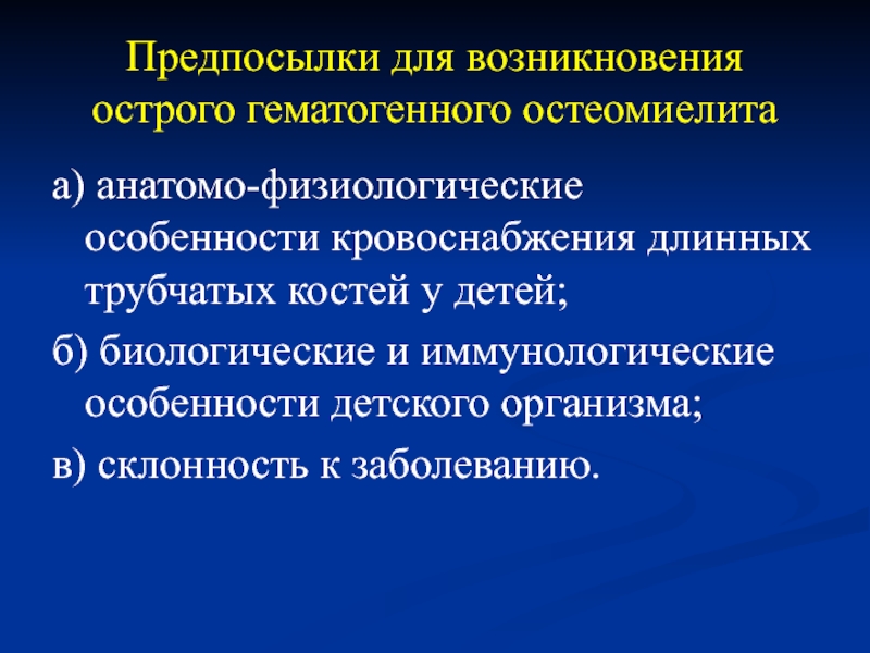 Слайд 34Предпосылки для возникновения острого гематогенного остеомиелита