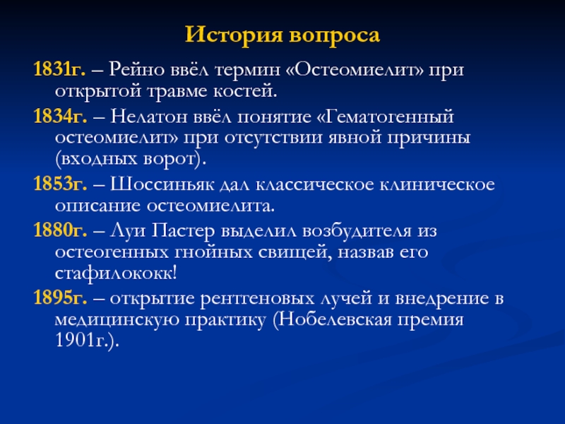 1853г. – Шоссиньяк дал классическое клиническое описание остеомиелита.