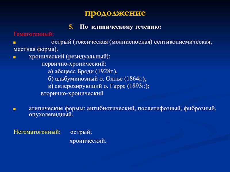 1834г. – Нелатон ввёл понятие «Гематогенный остеомиелит» при отсутствии явной