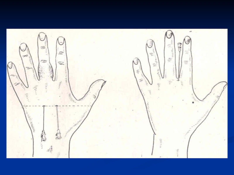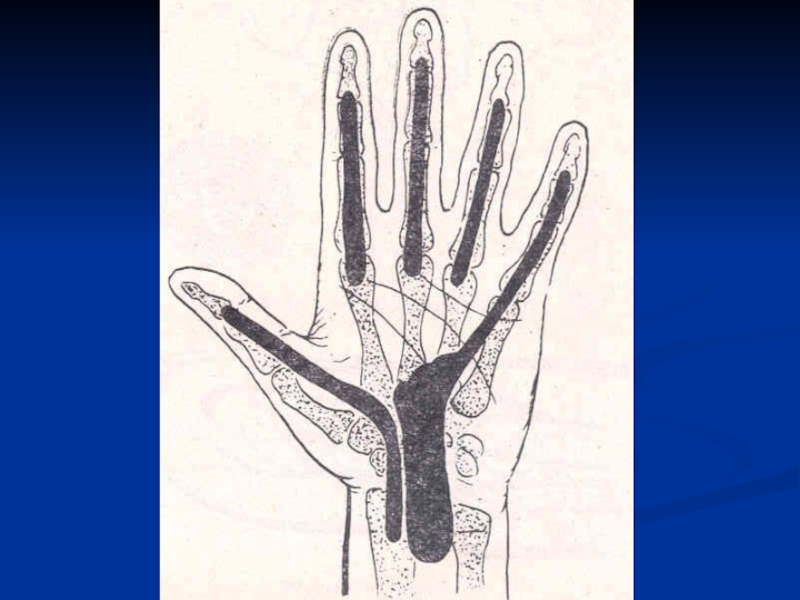 7. Перекрестная (U-образная) флегмона кисти с поражением пространства Пирогова-Парона.