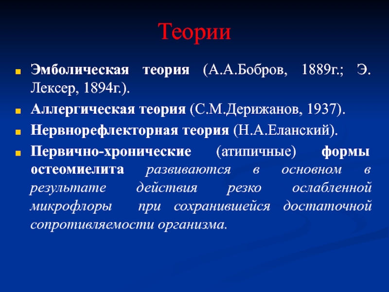 Эмболическая теория (А.А.Бобров, 1889г.; Э.Лексер, 1894г.).