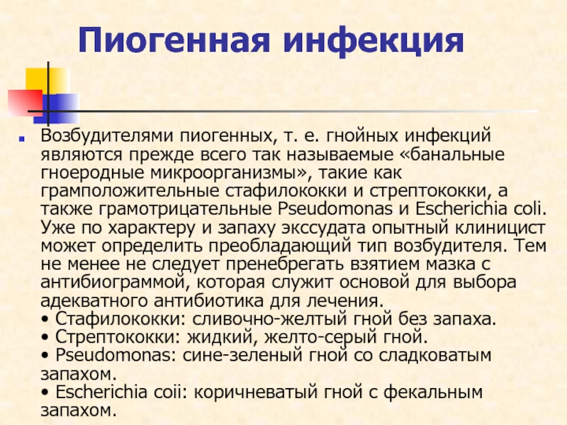 Виды инфекций  Для пиогенной инфекции бактерий Pseudomonas характерен сине-зеленый гной со сладковатым запахом.