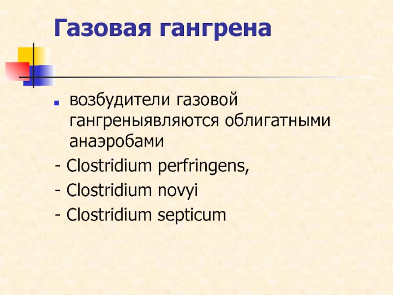 Газовая гангрена  возбудители газовой гангреныявляются облигатными анаэробами - Clostridium perfringens, - Clostridium novyi - Clostridium septicum