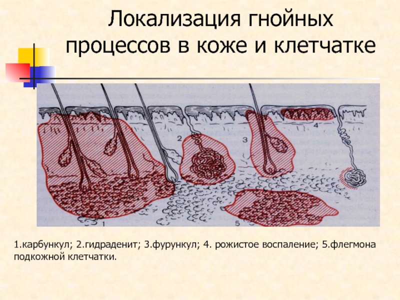 Локализация гнойных процессов в коже и клетчатке1.карбункул; 2.гидраденит; 3.фурункул; 4. рожистое воспаление; 5.флегмонаподкожной клетчатки.