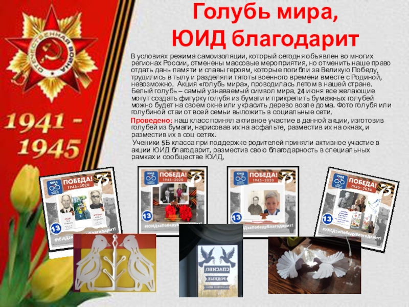массовые мероприятия, но отменить наше право отдать дань памяти и славы героям, которые погибли за Великую Победу, трудились в тылу и разделяли тяготы военного времени вместе с Родиной, невозможно. Акция «голубь мира», проводилась летом в нашей стране. Белый голубь – самый узнаваемый символ мира. 24 июня все желающие могут создать фигурку голубя из бумаги и прикрепить бумажных голубей можно будет на своем окне или украсить дерево возле дома. Фото голубя или голубиной стаи от всей семьи выложить в социальные сети.