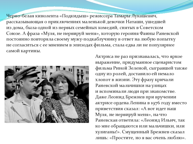 Союзе. А фраза «Муля, не нервируй меня», которую героиня Фаины Раневской постоянно повторяла своему мужу-подкаблучнику в ответ на любую попытку не согласиться с ее мнением в эпизодах фильма, стала едва ли не популярнее самой картины.