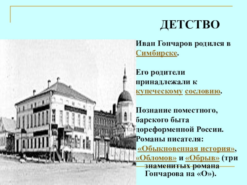 ДЕТСТВОИван Гончаров родился вСимбирске. Его родителипринадлежали ккупеческому сословию. Познание поместного,барского бытадореформенной России.Романы писателя: «Обыкновенная история»,«Обломов» и «Обрыв» (три знаменитых романа Гончарова на «О»).