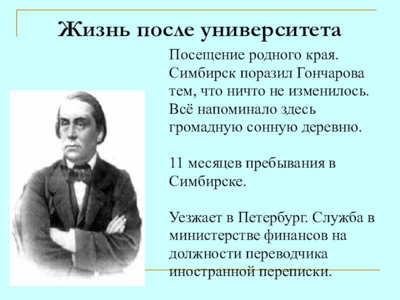 Жизнь после университета Посещение родного края.Симбирск поразил Гончароватем, что ничто не изменилось.Всё напоминало здесьгромадную сонную деревню. 11