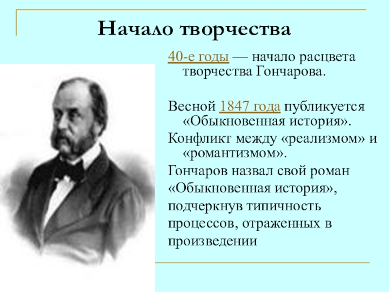 Начало творчества 40-е годы — начало расцвета творчества Гончарова. Весной 1847 года публикуется «Обыкновенная история».Конфликт между «реализмом» и