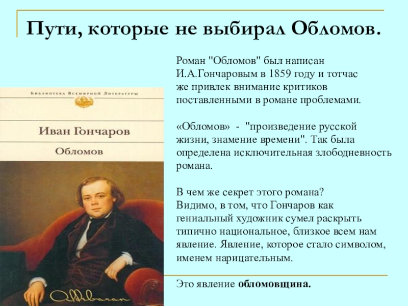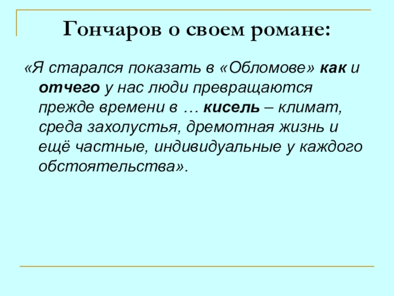 Гончаров о своем романе:«Я старался показать в «Обломове» как и отчего у нас люди превращаются прежде времени