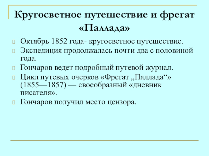 Кругосветное путешествие и фрегат «Паллада» Октябрь 1852 года- кругосветное путешествие. Экспедиция продолжалась почти два с половиной года.Гончаров