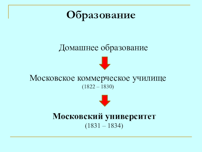 Образование Домашнее образованиеМосковское коммерческое училище(1822 – 1830)Московский университет(1831 – 1834)