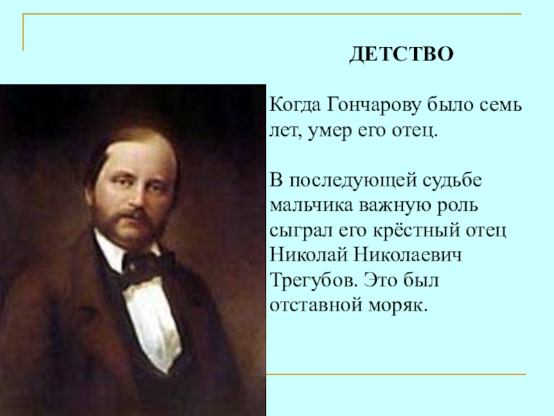 ДЕТСТВОКогда Гончарову было семьлет, умер его отец. В последующей судьбемальчика важную рольсыграл его крёстный отецНиколай НиколаевичТрегубов. Это