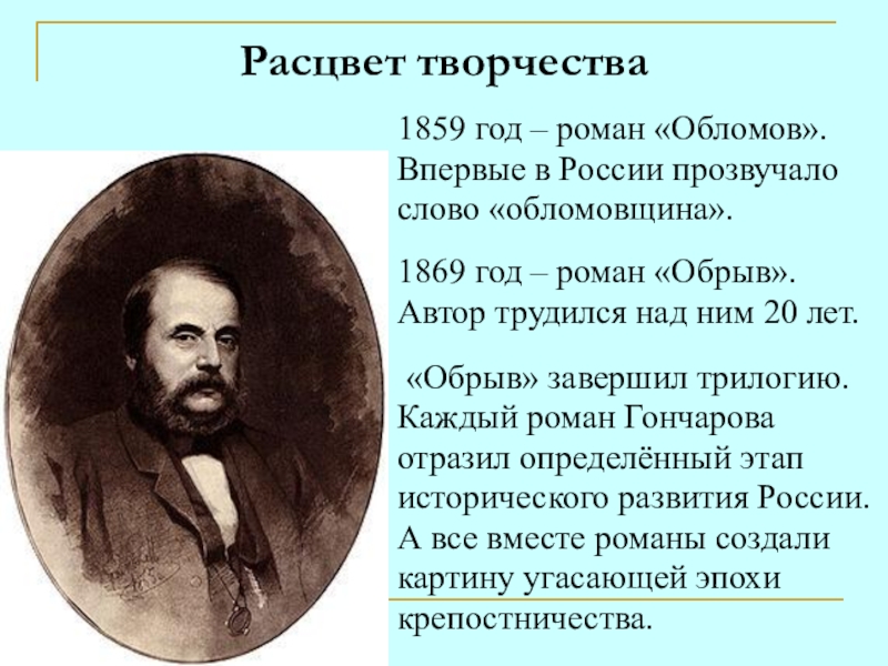 Расцвет творчества 1859 год – роман «Обломов».Впервые в России прозвучалослово «обломовщина». 1869 год – роман «Обрыв».Автор трудился